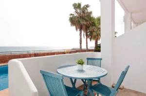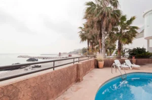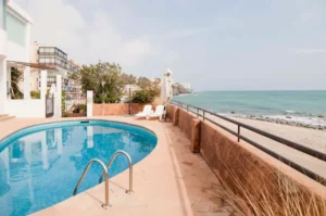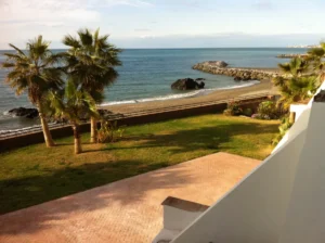 Está en un recinto cerrado al borde del mar, no hay paseo marítimo delante, se sale directamente a la playa. ¡¡¡¡¡SOLO SE OYE EL MAR!!!!!